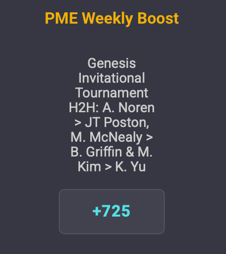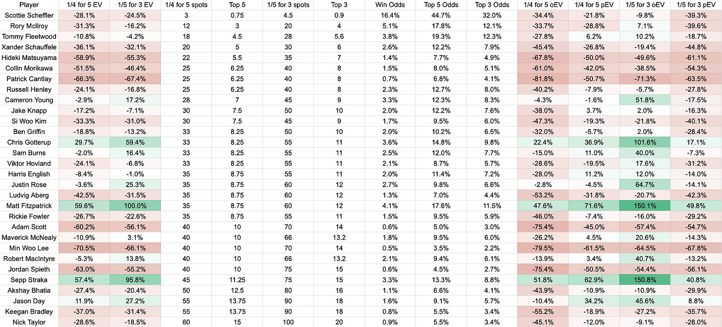 Alex discovered the Top 3 each way bet is actually a lot more +EV than anyone realized once he ran simulations. He explains it in more detail on the show if you want to hear more, but these are the results in the different markets for players this week. As you can see, the boost given to the outright odds for each player makes this type of bet more profitable in the long term while the equity you give up moving from 5 places to 3 places isn’t actaully all that substantial. Of course, you actaully need to win a few of these bets to realize the EV. They always forget to mention that part.