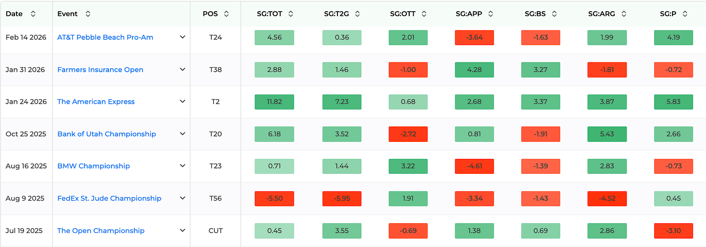 Sepp Straka — This makes it three weeks in a row for me and Straka. His irons faltered in both weekend rounds on the front nine only to rebound nicely each time on his way in leading to a T2. He’s not the typical profile because of his lack of distance, but the key thing was seeing him actually gain strokes with his putter last week. In fact, he gained across the board. Straka sits 4th in the field in SG: T2G in 2026.