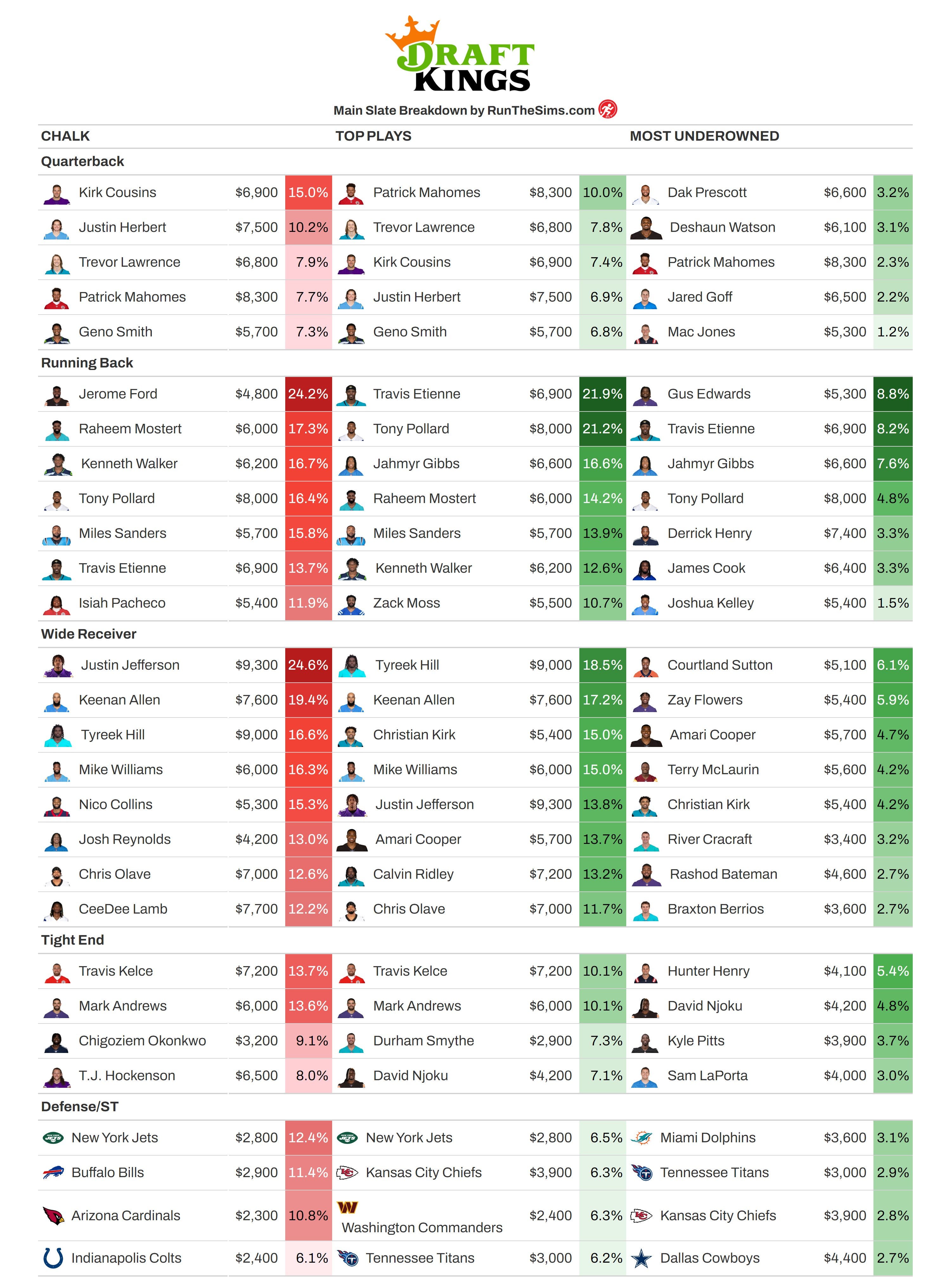 Justin Freeman released this handy cheatsheet to guide you quickly this weekend. This chart is from Friday evening. Once certain players are offically ruled IN or OUT, then everything will get a fresh update Sunday morning. But it should give you a sense of what people are doing on DraftKings this week.